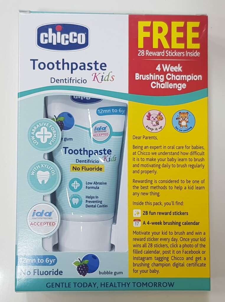 Chicco Baby Moments Mix Fruit Flavored Baby Toothpaste 50g With Chicco Toothbrush For Kids Orange (1-6y) - Combo Of 2 Items