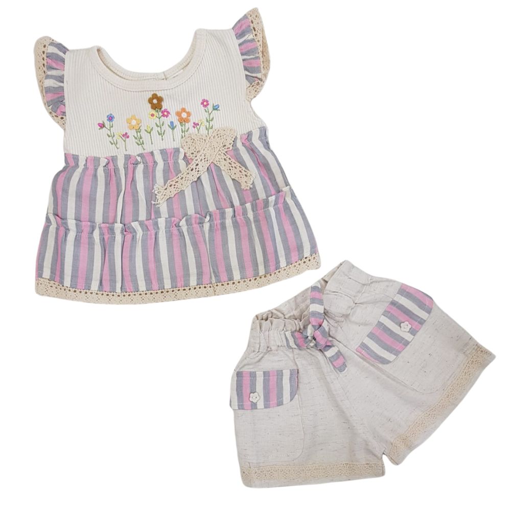 Kiko Cotton Half Sleeves Frock And Short With Stripes And Embroidery Work - Pink