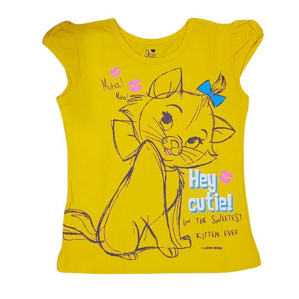 I Love Mom , Cotton , Half Sleeves , Top For Girls , Cat Printed , Yellow , 3-4 Years , 2-3 Years