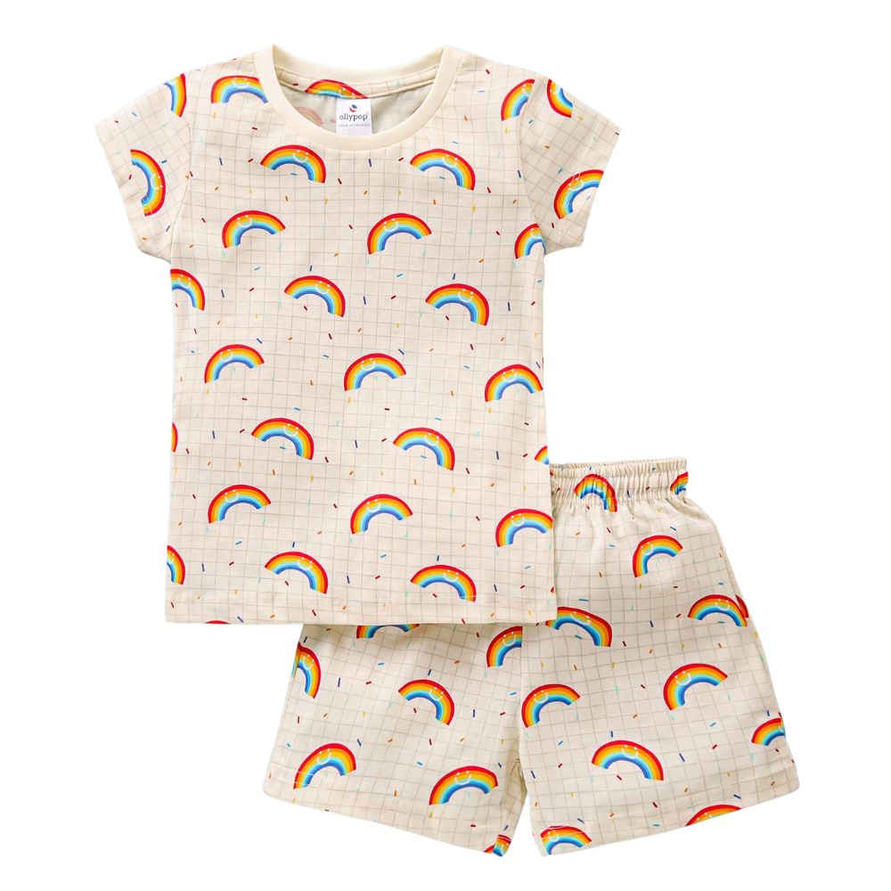 Ollypop Cotton Knit Half Sleeves Nightsuit With Rainbow Print - Cream