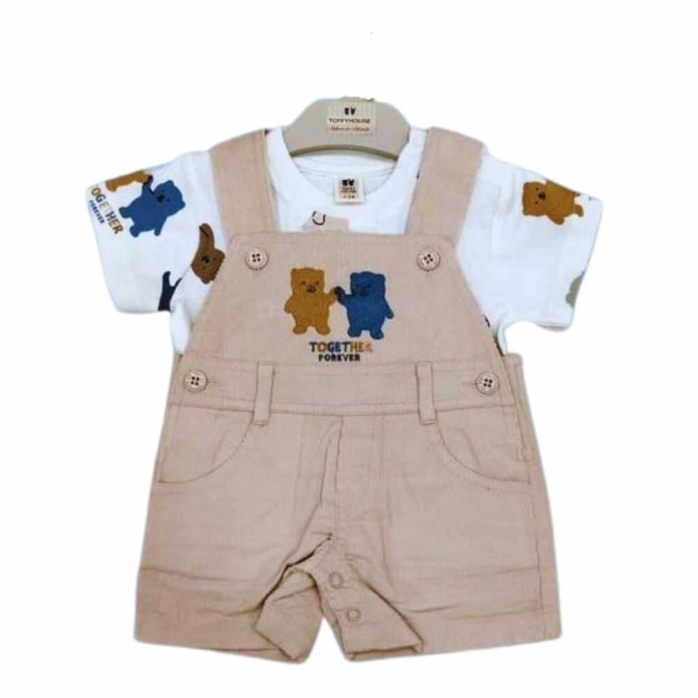 Shop Toffy House half sleeves cargo dungaree set for boys in khaki. Soft cotton outfit with comfortable fit, perfect for summer playtime, casual outings, and daily wear. |