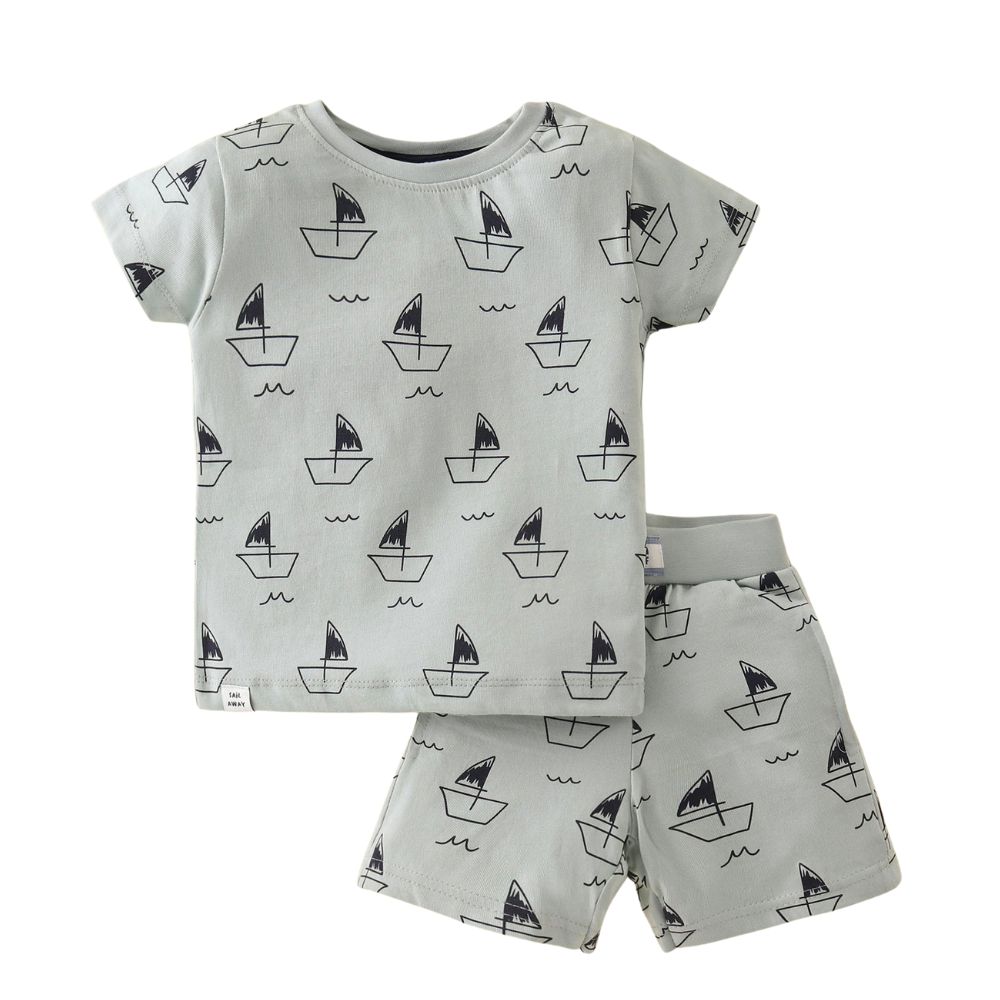 Shop Ollypop Cotton Sinker Knit Half Sleeves T-Shirt & Shorts Set in Grey with cute boat print. Soft, breathable cotton knit perfect for babies? daily wear and playtime. |