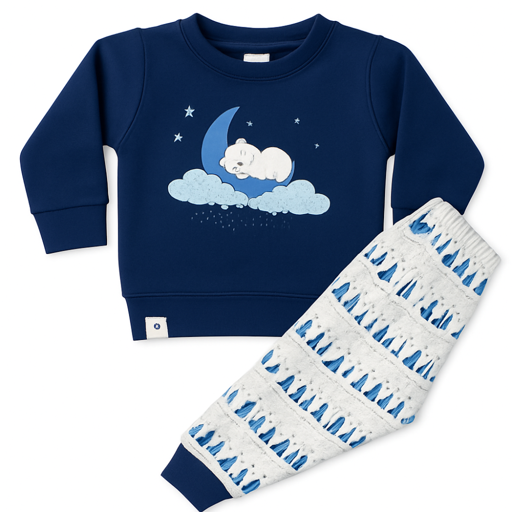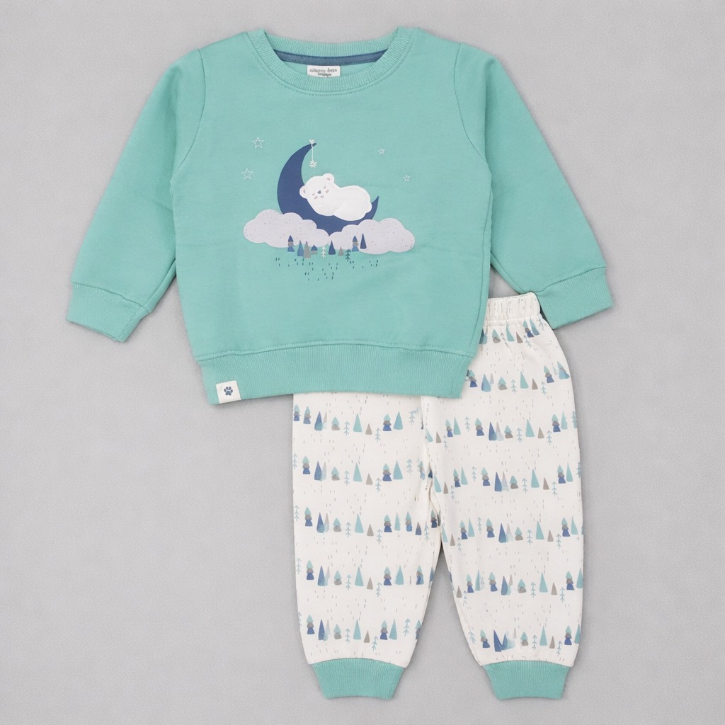 Soft and comfortable two-piece pajama set for babies and toddlers featuring a dreamy bear-on-moon sweatshirt and forest-patterned pants. Perfect for cozy nights and sensitive skin. |