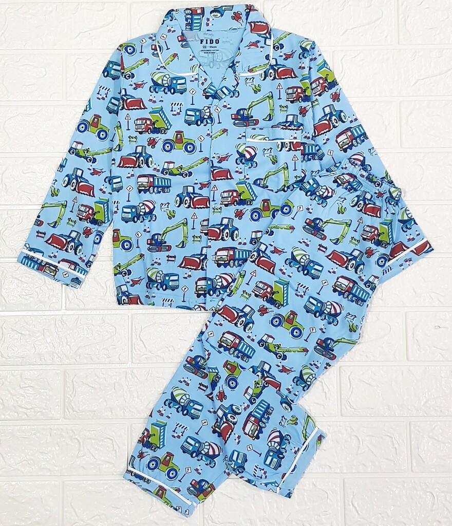 Cotton Night Suit , Track Print , Full Sleeves , Collar Neck , Light Grey , Blue |