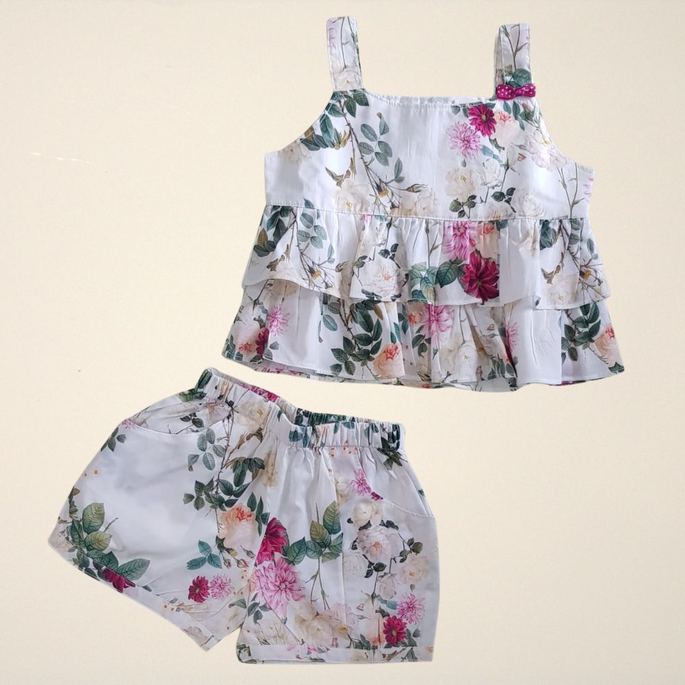 Cotton, Floral Printed, Party Wear For Girls, Sleeveless Top With Shorts |