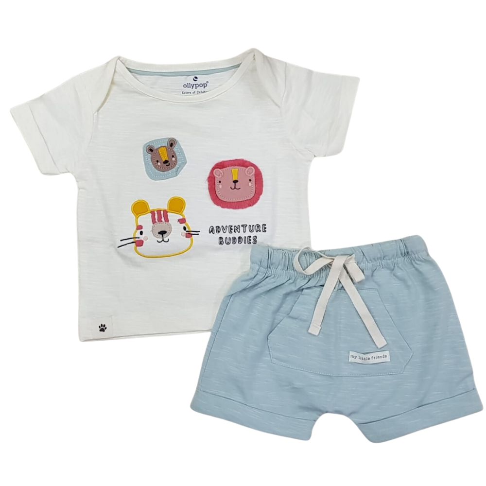 Ollypop Interlock Knit Half Sleeves T-Shirt & Short Set Animal Embroidery - Cream