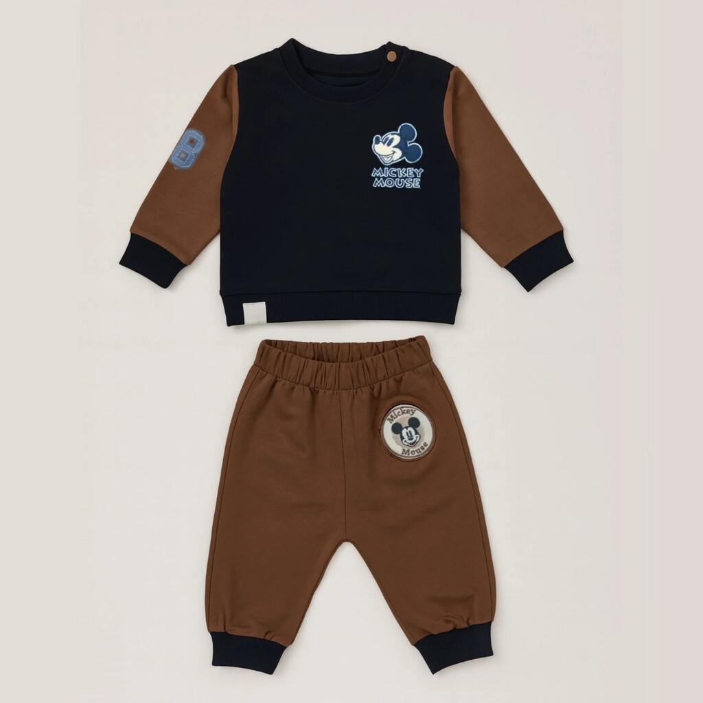 Ollypop Fleece Knit Full Sleeves Winter Wear T-Shirt & Joggers Set With Mickey Mouse Text Print - Brown
