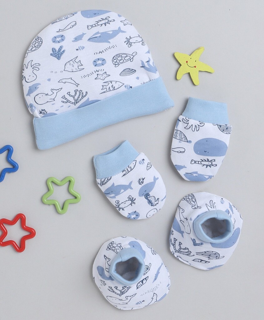 Cotton Cap Mittens Booties With Print