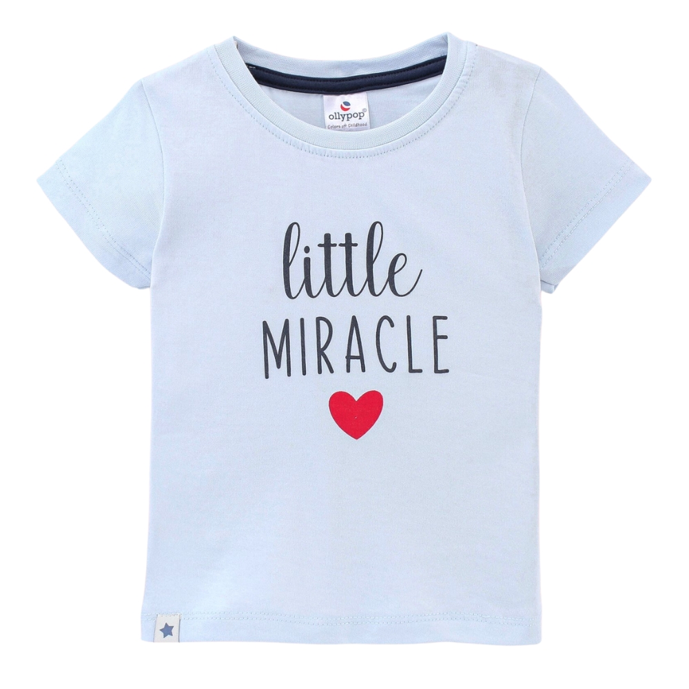 Shop Ollypop cotton half sleeves T-shirt in sky blue with Little Miracle text print. Soft, breathable & comfy for everyday kids wear. |